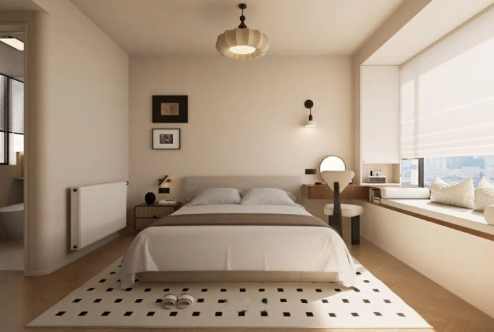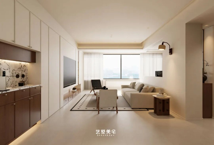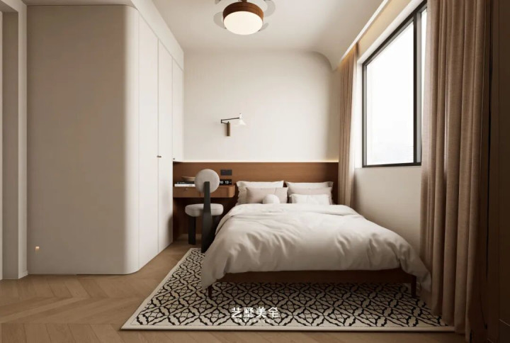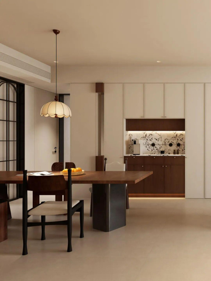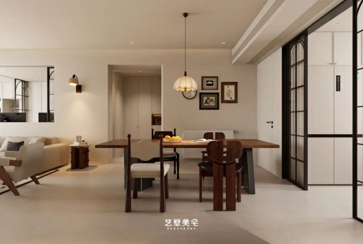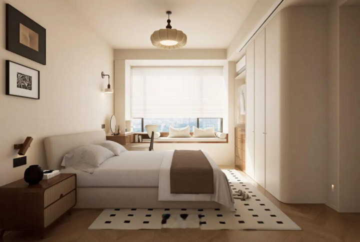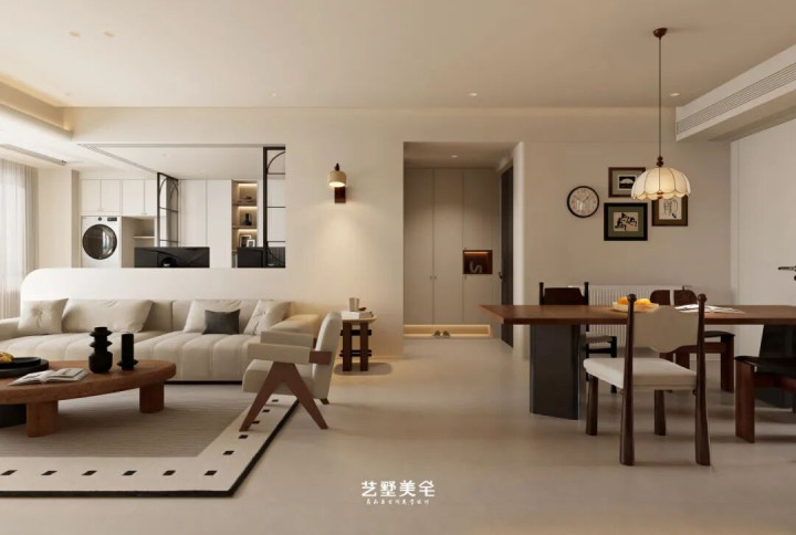 空间整体以柔和的暖色系奠定温馨基调。局部通过中古家具的胡桃木色点缀,增加视觉层次的温暖感。材质上,结合木材的温润与织物的柔软,在光线的漫射下,共同编织出宁静、包裹感强且极具亲和力的室内氛围。