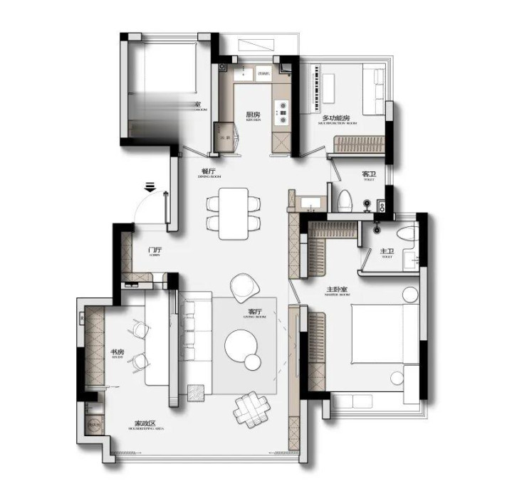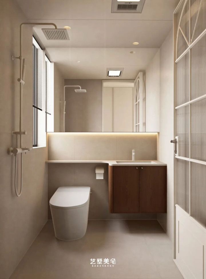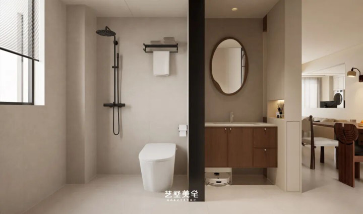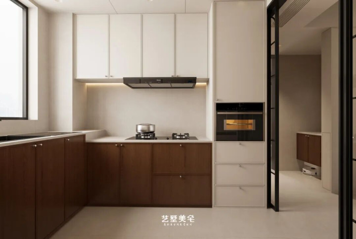 将“重收纳”作为保持空间宁静感的关键策略。采用嵌入式柜体、系统化壁柜及多功能家具等形式,将收纳空间最大化、隐形化。物品各归其位,视觉上仅保留精心挑选的陈设与生活痕迹,确保公区开阔整洁,私人区域井然有序,从而实现形式与功能的高度统一,服务于夫妇二人高效、简洁的生活方式。
