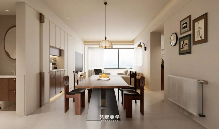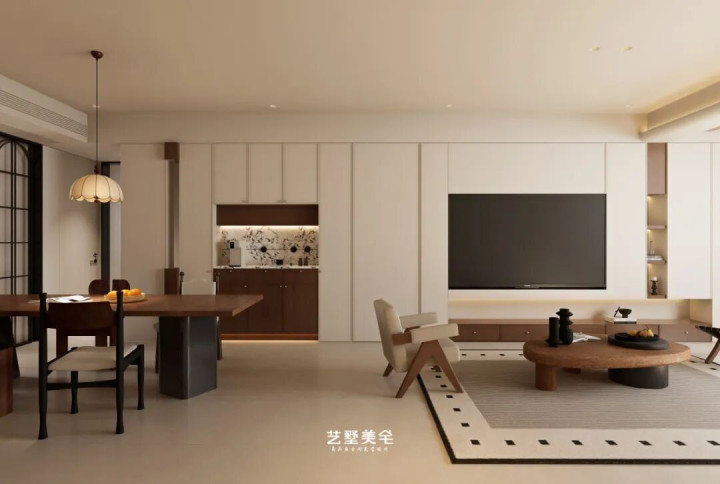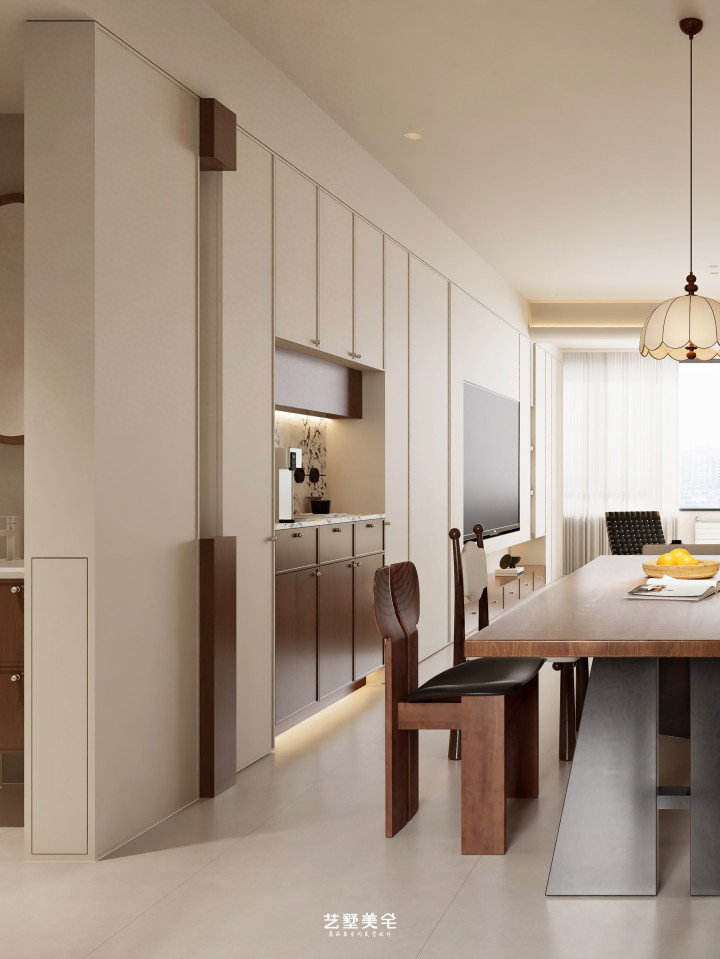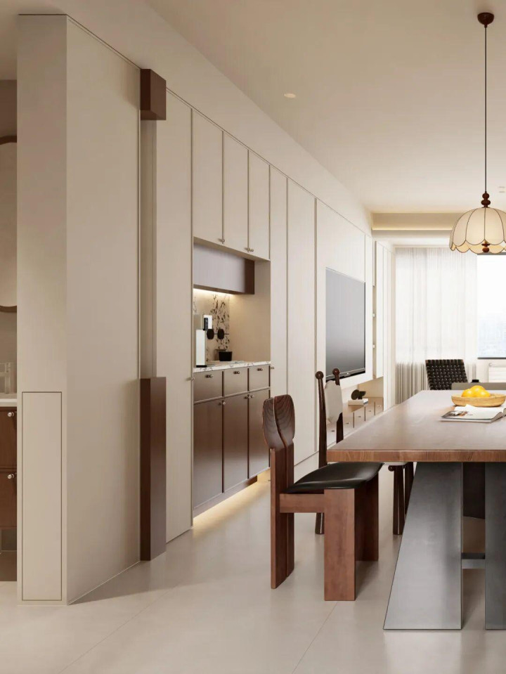 ❸客餐厅整面收纳柜,嵌入水吧区、隐形门、电视机为整体。