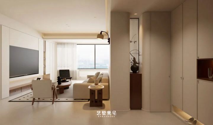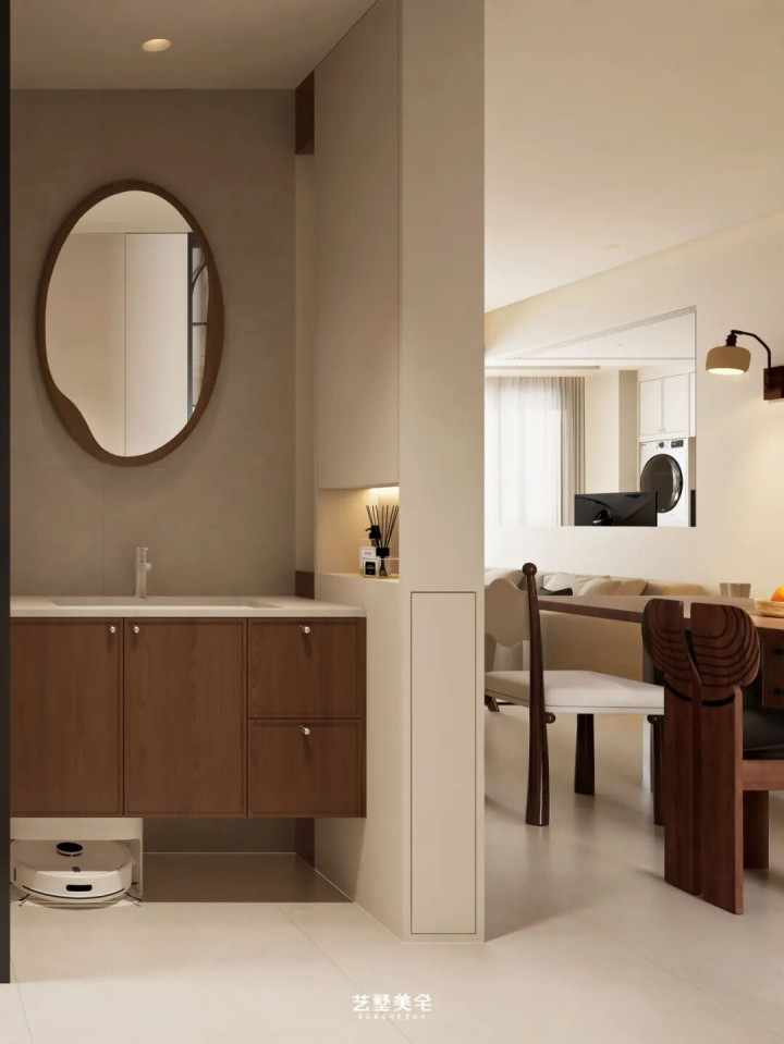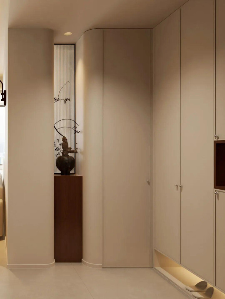 通过微改墙体,让光进到门厅,提升暗厅的采光问题。左侧承重柱用弧形圆角,弱化方柱的生硬,胡桃木纹的矮柜作为造景台,摆放陶艺花瓶提升艺术氛围。