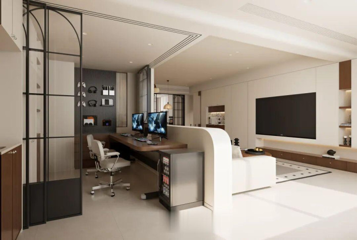 独立规划的电竟房,兼顾高效办公与沉浸式游戏体验。注重人体工学设计与设备集成,同时通过灯光氛围与舒适座椅搭配,使其成为释放压力、激发灵感的专属领地。