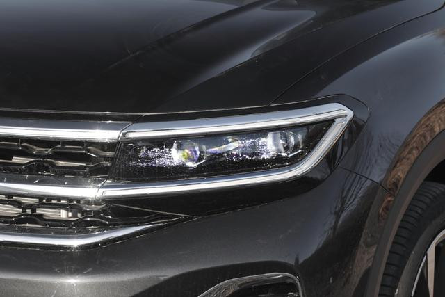 新款揽境前脸改动尤为明显。最大特征是发动机盖前端采用了大面积的封闭式面板,连接左右大灯。面板上嵌入两根细长的贯穿式灯带,大众品牌Logo也具备发光效果,强化了视觉连贯性与辨识度。值得注意的是,定位更运动的R-Line版本在面板上增加了专属的“R”标识。